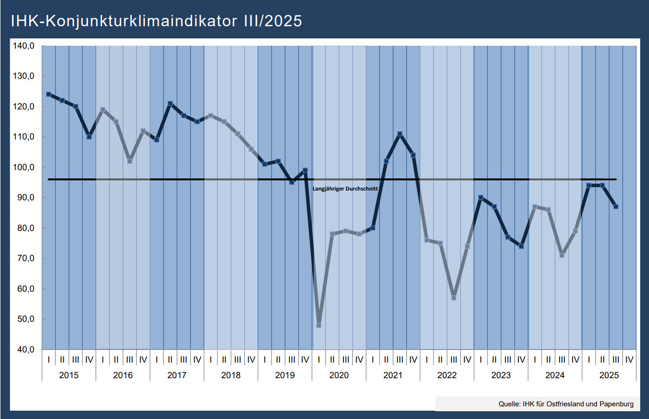 Emden (10. Oktober 2025) – Die aktuelle Lage der Betriebe in Ostfriesland und Papenburg hat sich im Herbst wieder leicht verschlechtert. Das ist das zentrale Ergebnis der aktuellen Konjunkturumfrage der Industrie- und Handelskammer für Ostfriesland und Papenburg (IHK). Der Klimaindex, der die aktuelle Lage und die Zukunftsaussichten in einem Wert zwischen 0 und 200 wiedergibt, sank von zuletzt 94 auf nun 87 Punkte. Verantwortlich dafür ist vor allem die aktuelle Geschäftslage der Betriebe, die sich im Vergleich zum Sommer verschlechtert hat. Die Zukunftsaussichten sind auf einem ähnlich zurückhaltenden Niveau geblieben wie im Sommer.