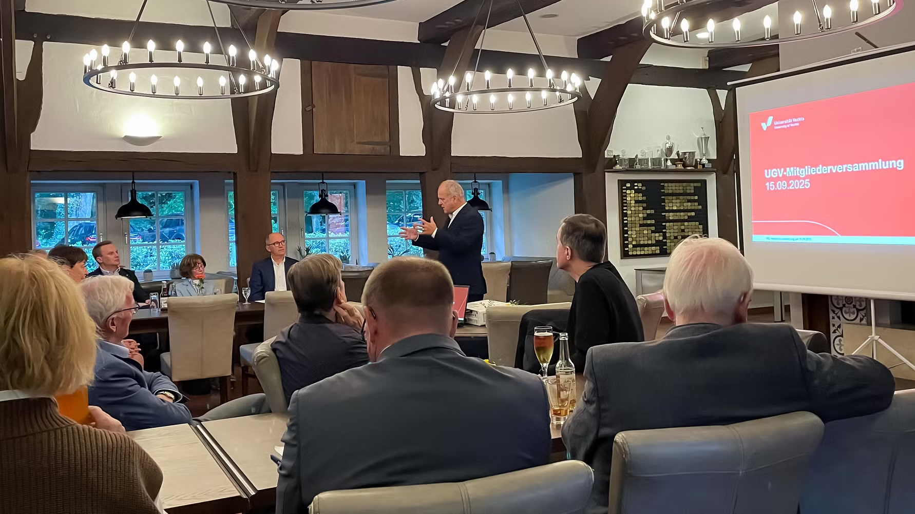 Vechta (17. September 2025) – Zu einem gemeinsamen Austausch mit dem Präsidium der Universität Vechta hatte am vergangenen Montag die Universitätsgesellschaft Vechta eingeladen. Ziel war es, die langjährigen Förderer und Förderinnen der Universität über aktuelle Herausforderungen der Universität zu informieren. „Ich freue mich sehr, dass wir heute einen exklusiven Einblick in die aktuelle Situation der Universität Vechta bekommen“, so Bernd Meerpohl, Vorsitzender der UGV in seiner Begrüßung. Die Universitätsgesellschaft stehe fest an der Seite der Universität und wolle weiter bei deren Entwicklung unterstützen.