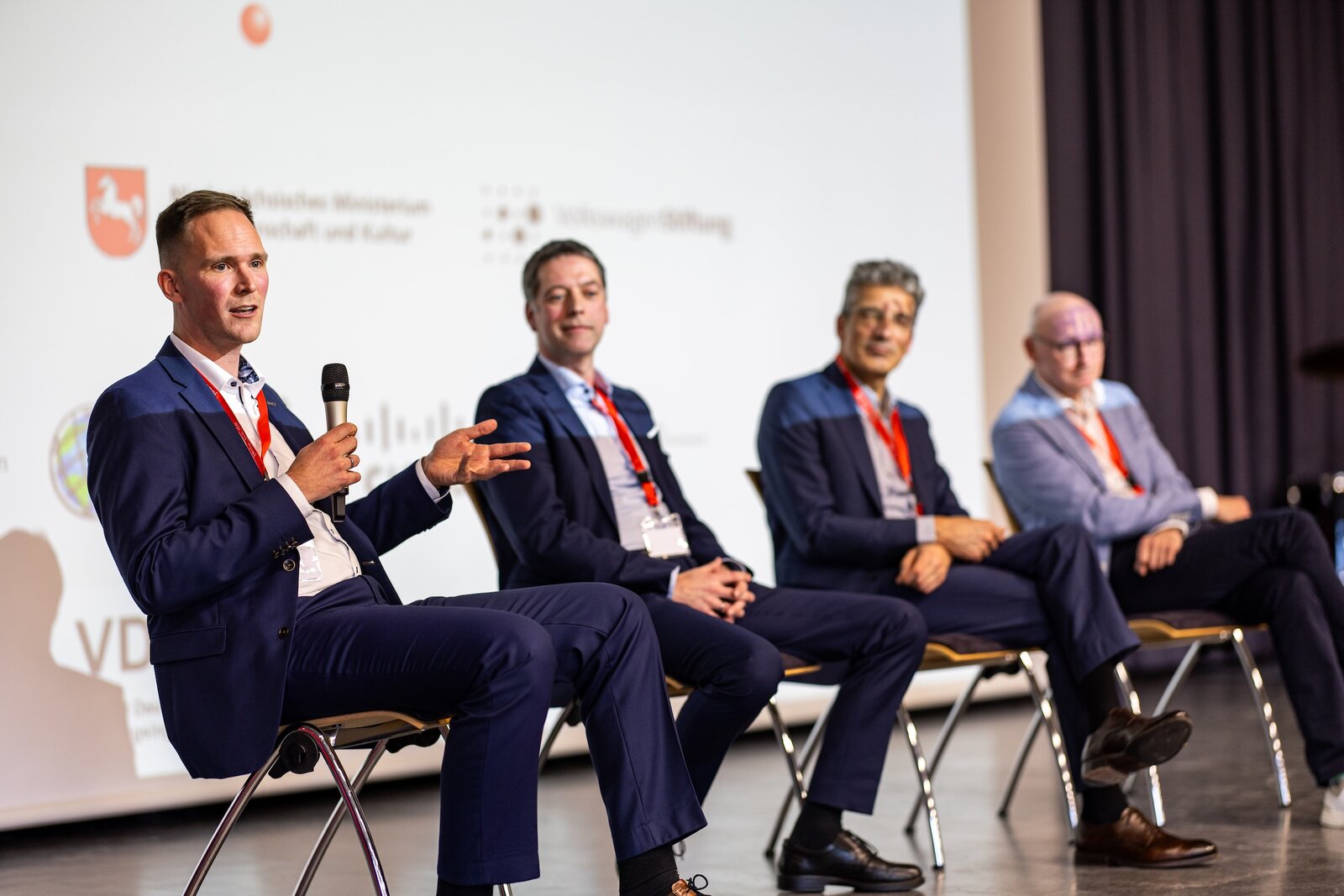 Nach einem Impulsvortrag von Prof. Dr. Antonio Krüger, CEO des Deutschen Forschungszentrums für Künstliche Intelligenz zu den aktuellen Entwicklungen von KI, leitete Dr. John Goodyear, Moderator für die Podiumsdiskussion, in den inhaltlichen Teil der Veranstaltung über. Zusammen mit Prof. Dr. Hero Weber (Vizepräsident Studium, Lehre, Weiterbildung der Jade Hochschule), Prof. Dr. Sascha Koch (Teilprojektleiter Spatial AI, Jade Hochschule), Prof. Dr. Christian Denker (Teilprojektleiter AI for Navigation, Jade Hochschule) und Prof. Dr. Antonio Krüger sprach er über die Umsetzungsmöglichkeiten von KI an der Jade Hochschule und über die zentralen gesellschaftlichen Herausforderungen, die mit KI gelöst werden können.