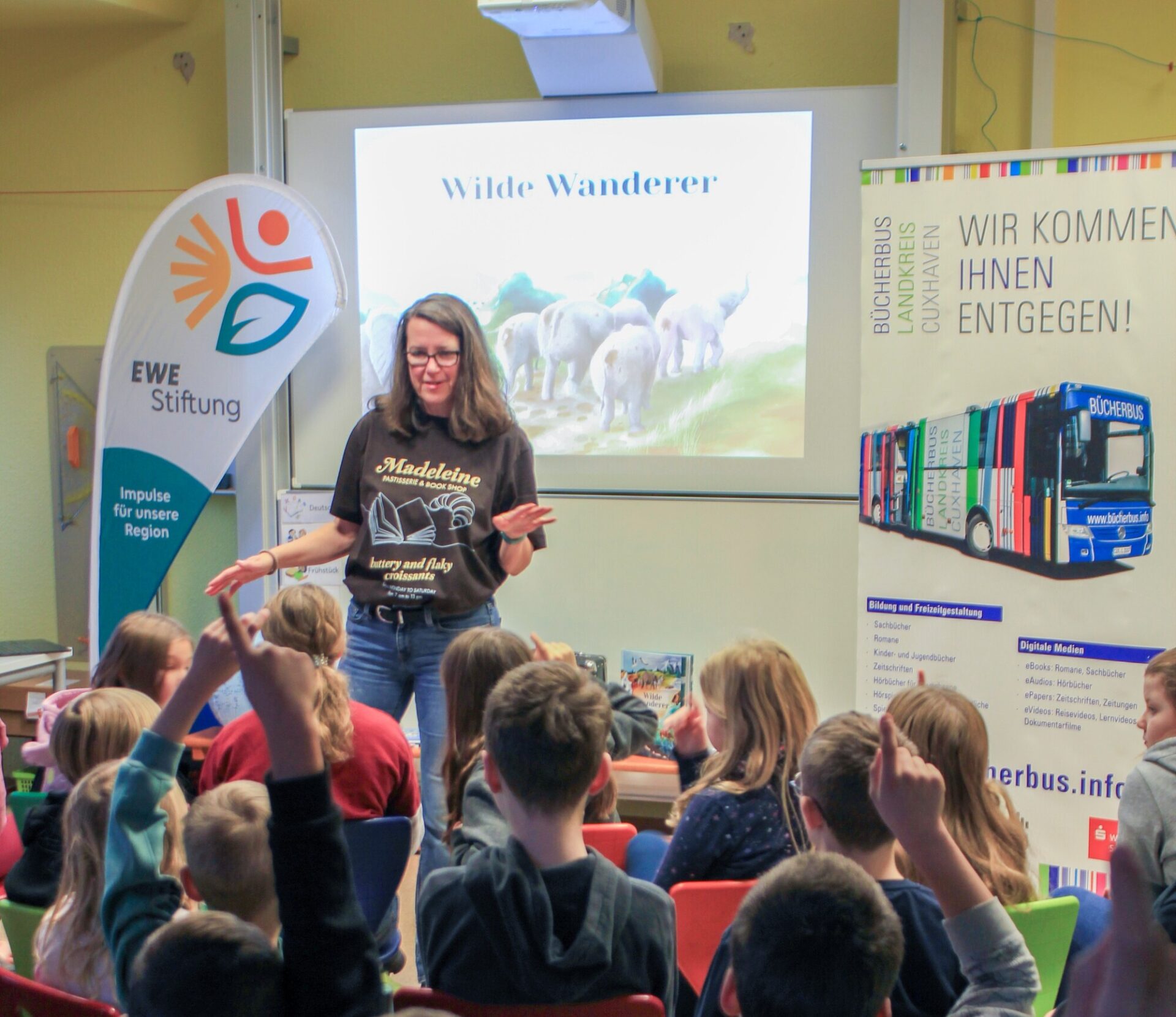 Landkreis Cuxhaven (4. Dezember 2025) – Für die „EWE Stiftung unterwegs“ und die Fahrbibliothek Landkreis Cuxhaven las die Autorin Anke Peterson für Grundschulklassen aus ihrem Buch „Wilde Wanderer“. Viele staunende Gesichter gab es beim Bilderbuchkino in Schiffdorf in der Grundschule Sellstedt und in der Bürgermeister-von-Soosten Grundschule in Wehdel, die im Rahmen der Lesereise der EWE Stiftung gemeinsam mit der Fahrbibliothek zu Vorleseorten wurden. Dort las die Autorin Anke Peterson vor über 120 Kindern. Mit ihren Geschichten über die erstaunlichen und abenteuerlichen Reiserouten von großen und kleinen Tieren sensibilisiert sie Kinder für Natur und Artenvielfalt. Die Illustrationen von Lisa Rammensee halfen beim Verstehen und veranschaulichten das Gehörte.